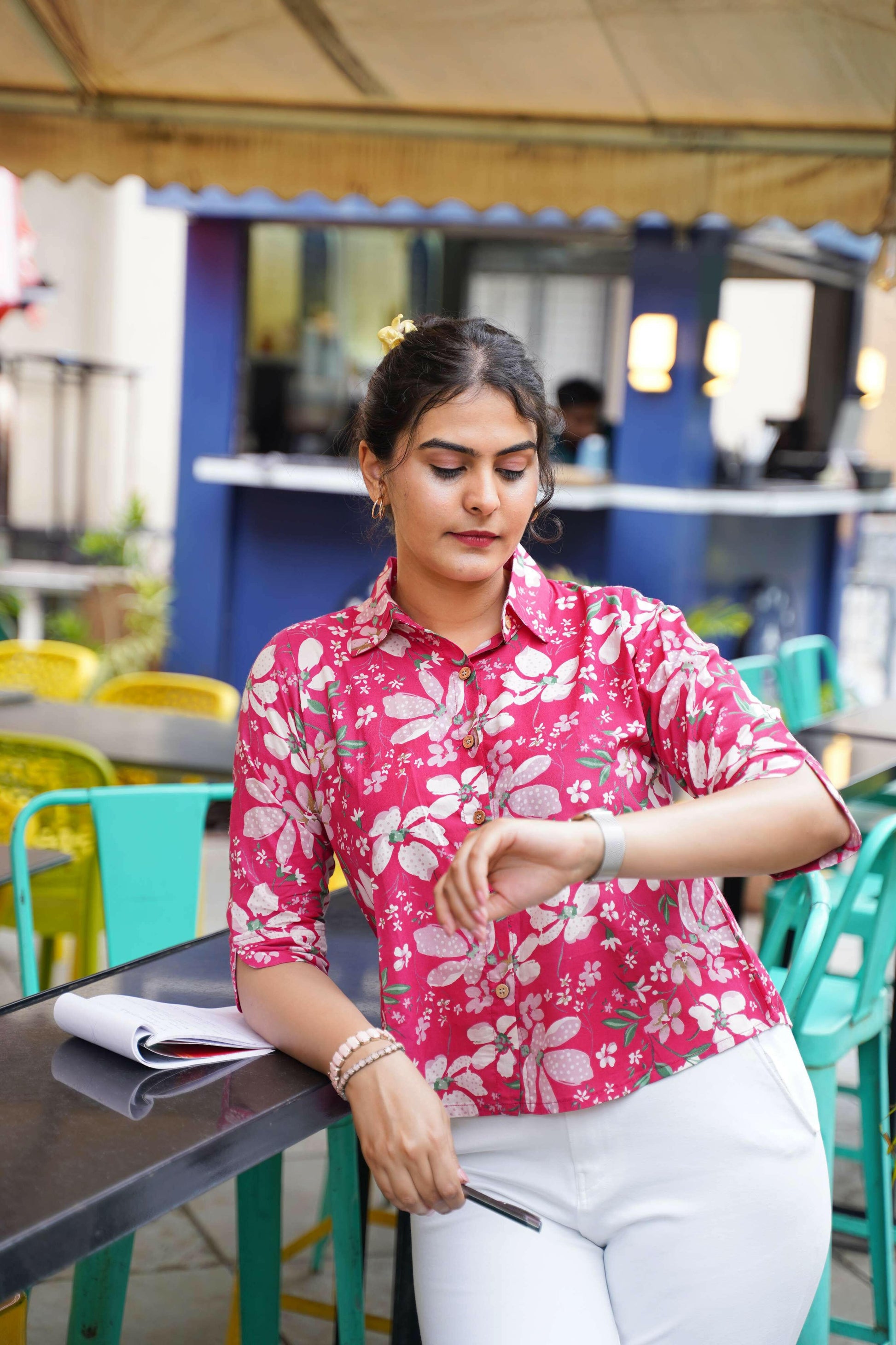 Make a bold, breezy statement with the Cherry Blush Shirt, cherry pink hue, button-down crafted in breathable cambric cotton.