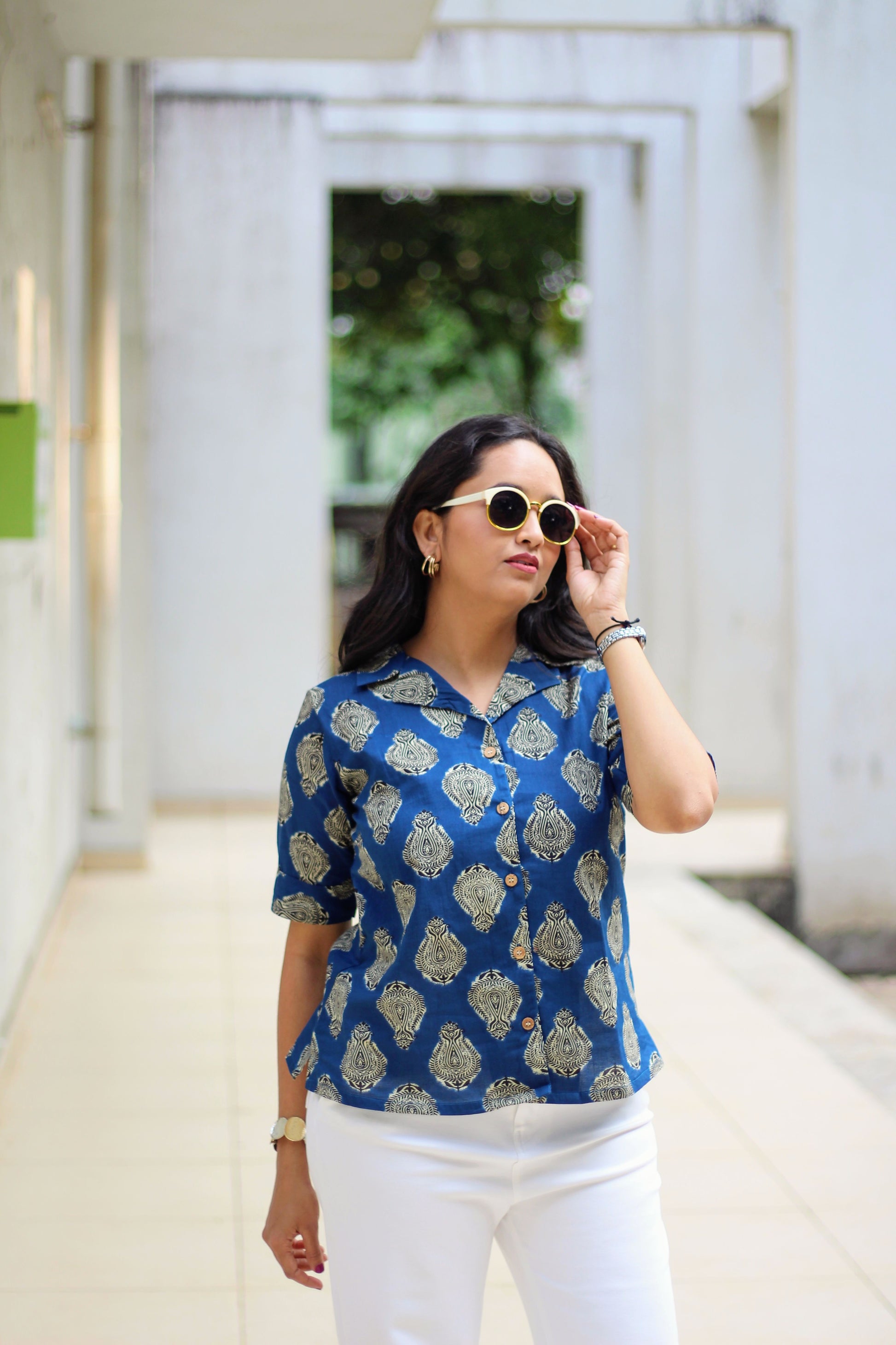 Pure cotton dark blue shirt with block print.