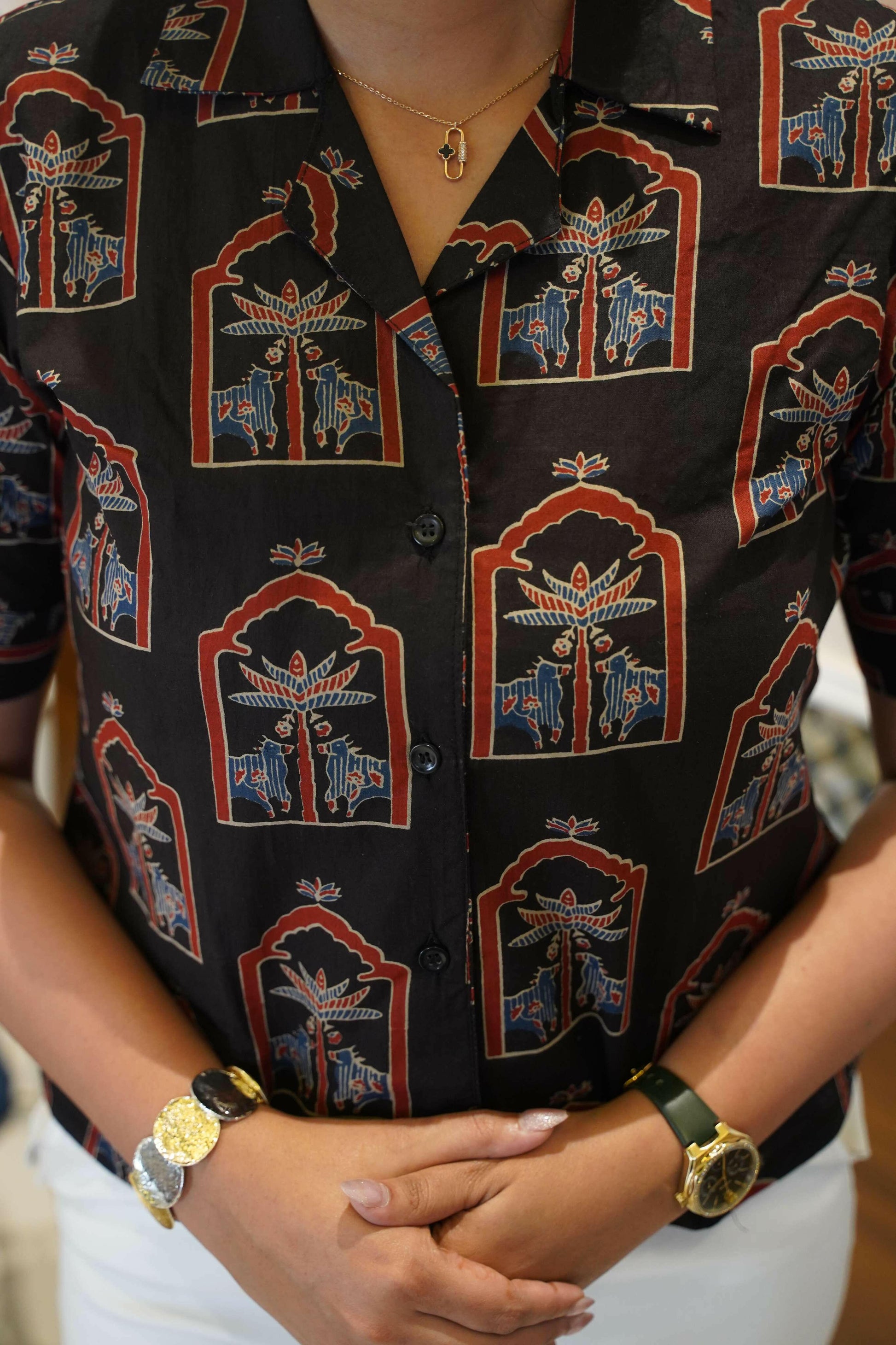 This shirt features intricate motifs of traditional Indian windows, cows, and coconut trees—an artistic nod to cultural heritage.