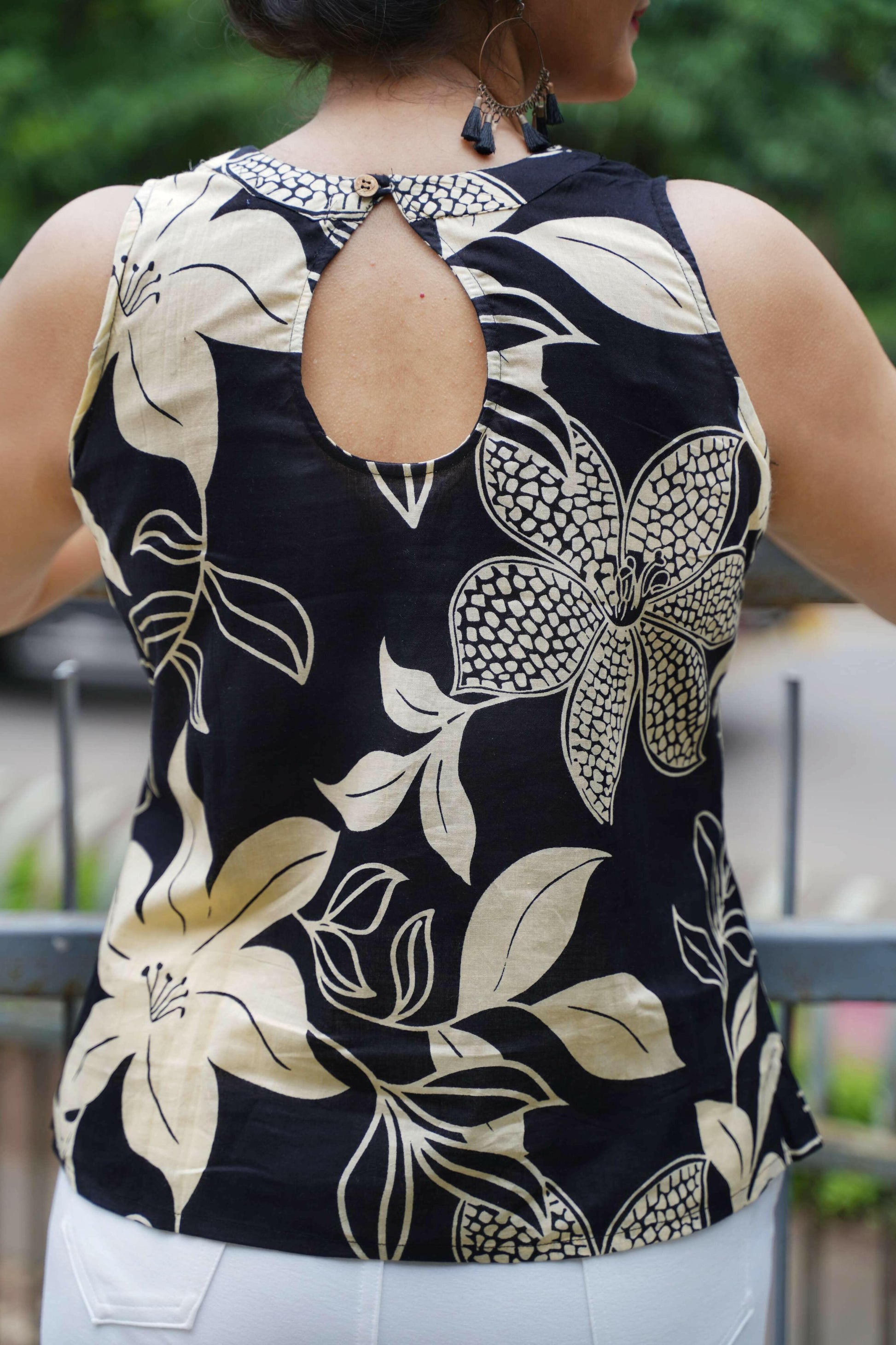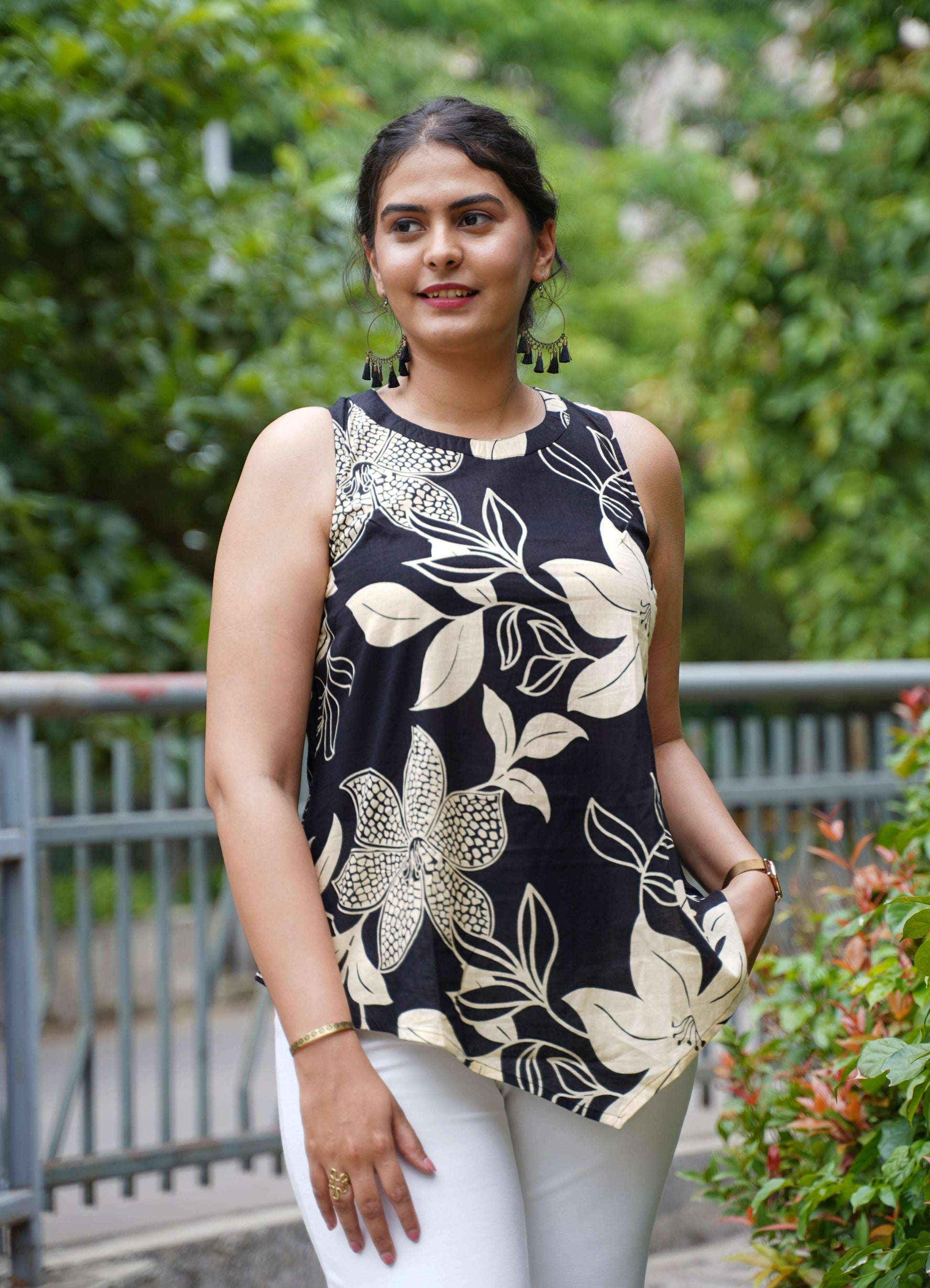 The asymmetric hem adds a modern edge, while the halter neckline with keyhole back lends a refined and graceful touch. Step into effortless elegance with the Noir Bloom Halter Top, crafted in soft 60-60 cotton and elevated with a bold floral print in a striking black and cream combo.Whether for brunch, a casual day at work, or a lunch date, this top pairs beautifully with denims, trousers, or skirts for a standout look.