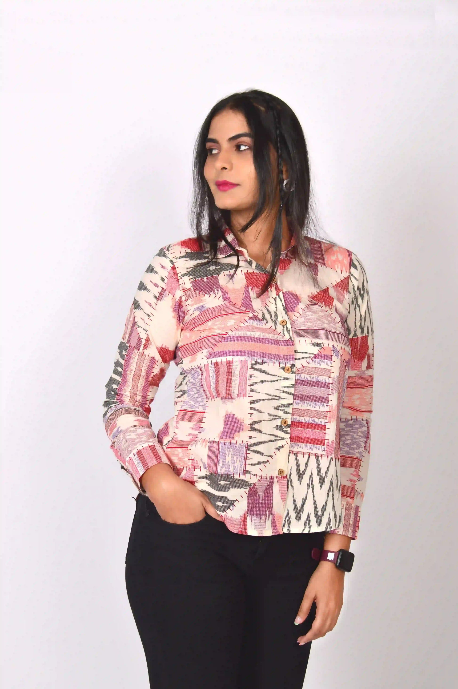 Elevate your wardrobe with our trendy cotton shirt for women, crafted with a unique multicoloured patchwork print.