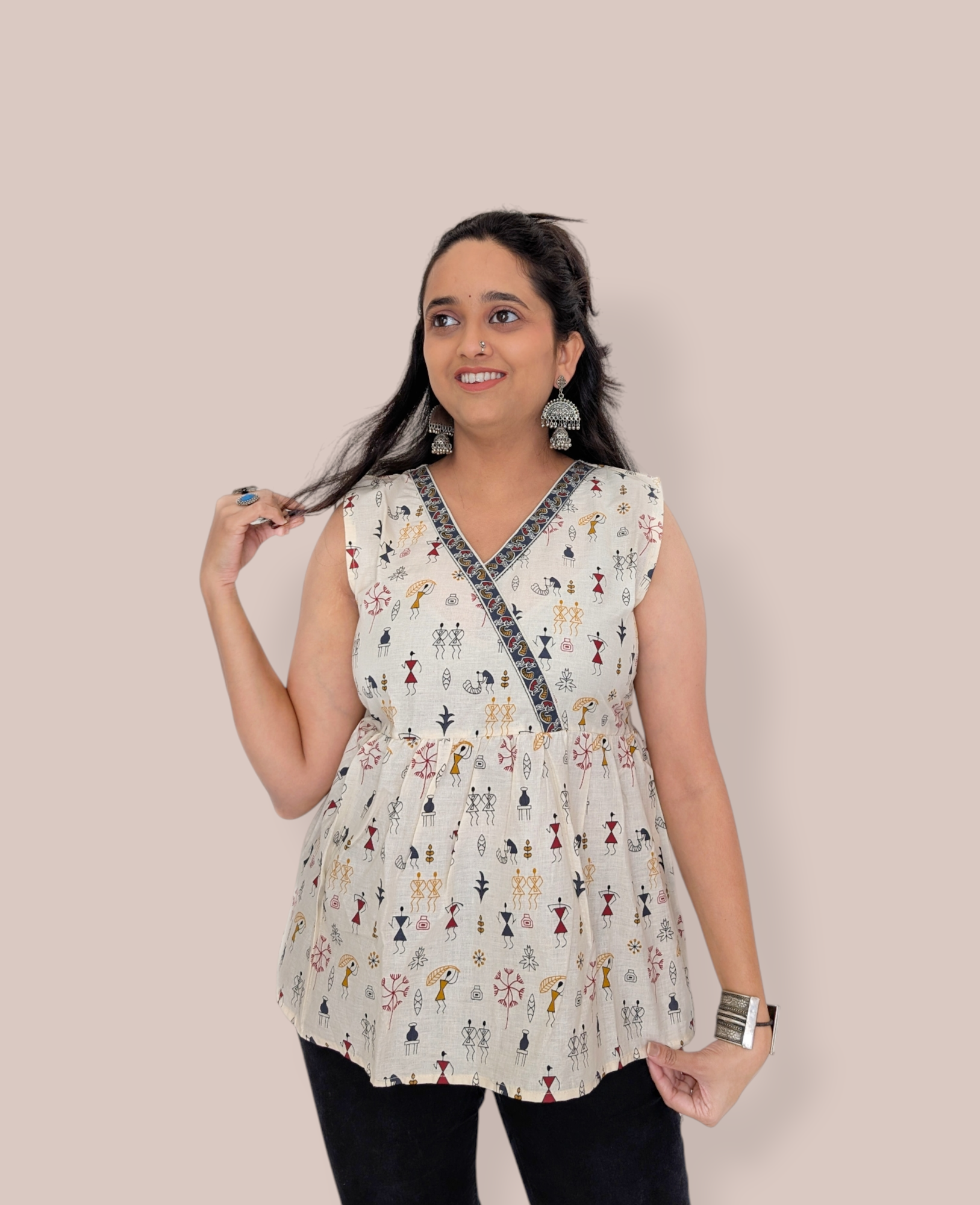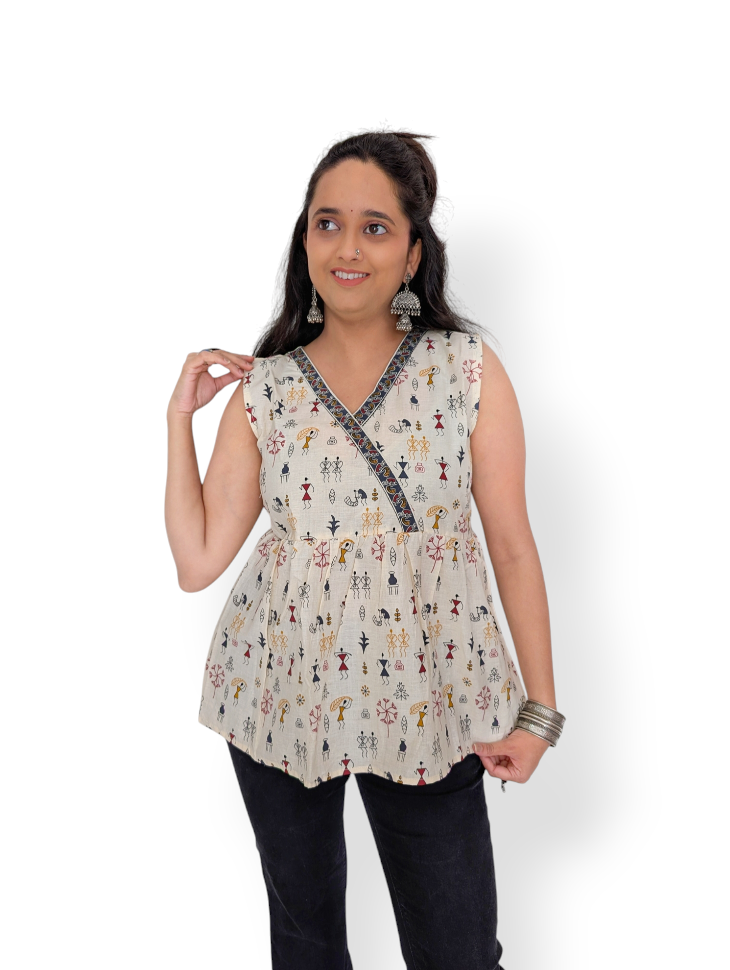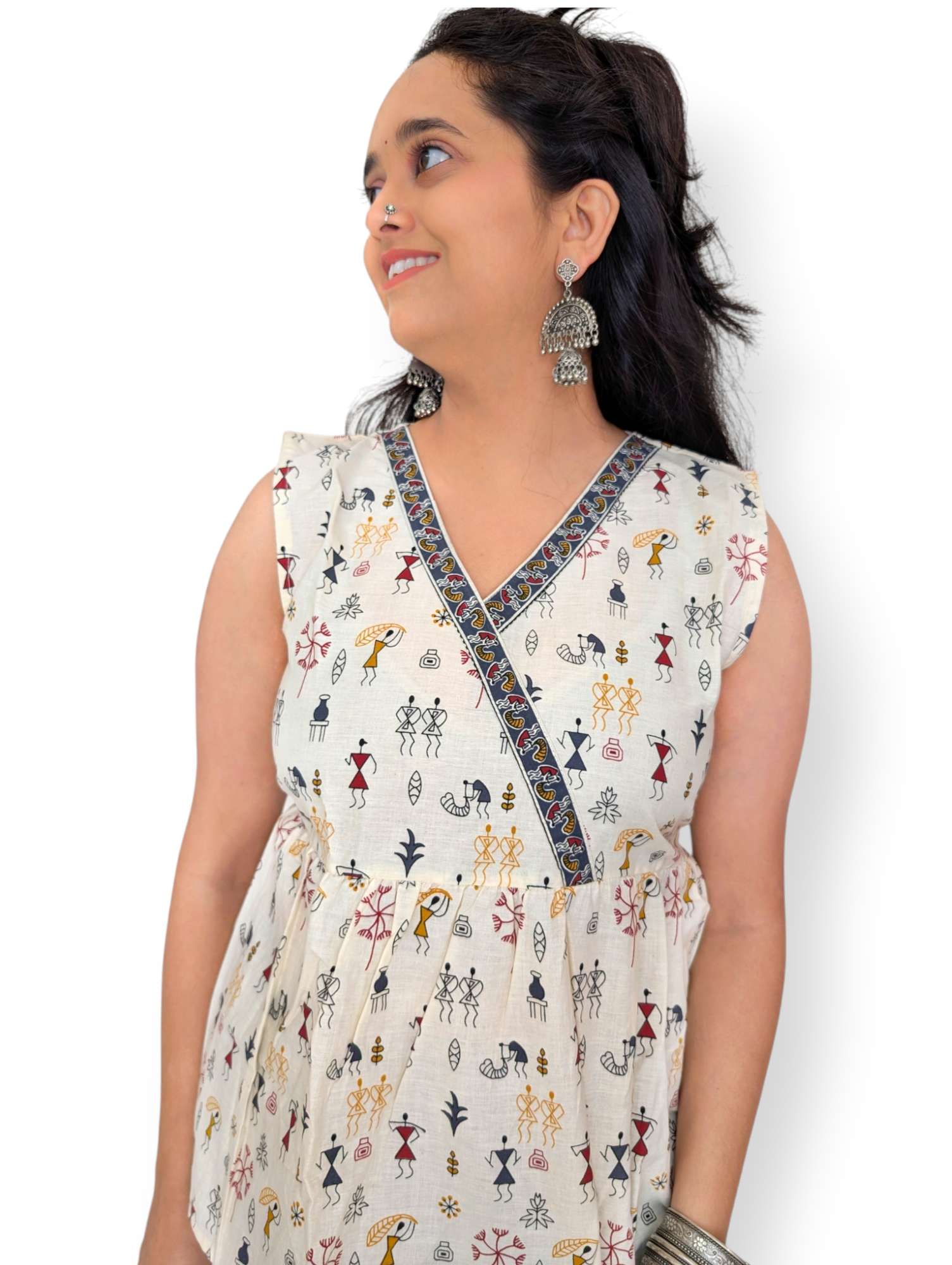 Made from regular cotton, this short kurti features an intricate Warli painting print in bold black on an off-white/cream base, offering a touch of cultural elegance to your everyday look.